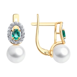 Серьги из красного золота с камнями Бриллиант, Изумруд гидротермальный и Жемчуг белый