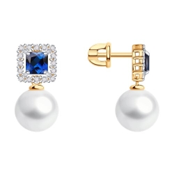 Серьги Пусеты из красного золота с камнями Сапфир бесцветный, Жемчуг белый и Корунд
